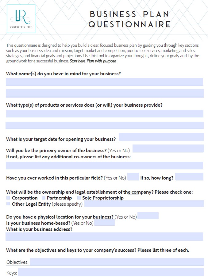 This questionnaire is designed to help you build a clear, focused business plan by guiding you through key sections such as your business idea and mission, target market and competition, products or services, marketing and sales strategies, and financial goals and projections. Use this tool to organize your thoughts, define your goals, and lay the groundwork for a successful business.